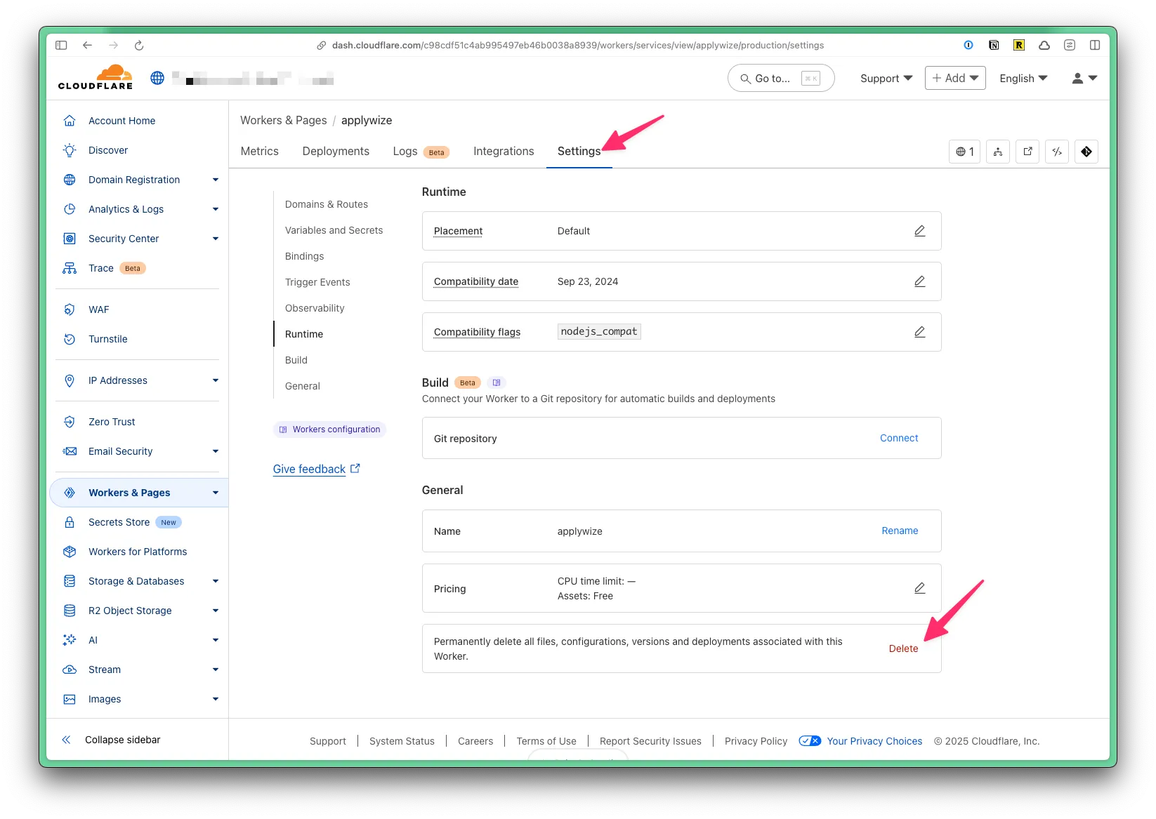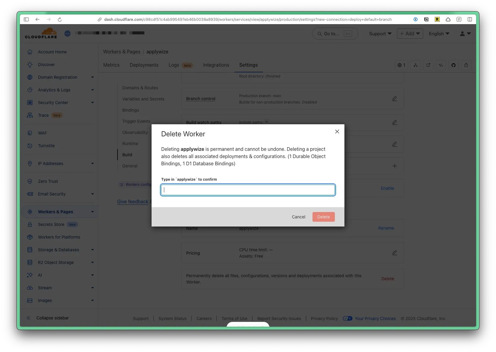 If for whatever reason, you need to delete your project through Cloudflare, go to Workers & Pages in the left side navigation. Then, click on the name of your project. Click on the Settings tab, then scroll to the bottom of the page. Click on the Delete button.