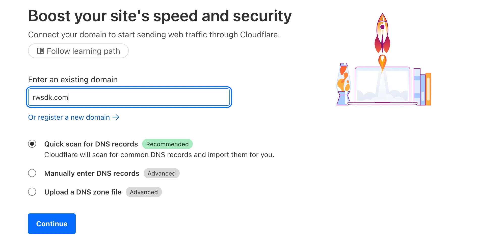 Next, search for the domain name you want to add. You can keep the “Quick scan for DNS records” option checked. Click Continue.